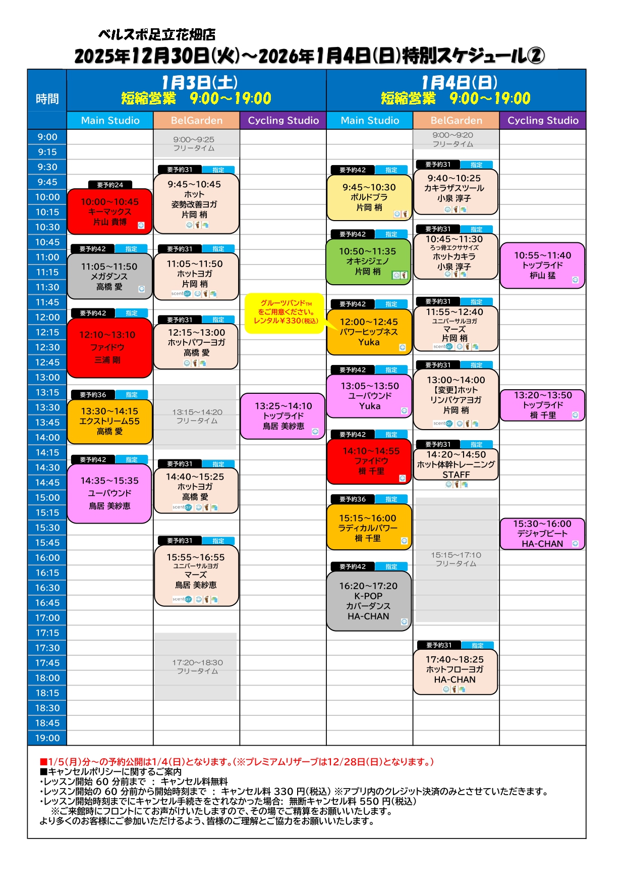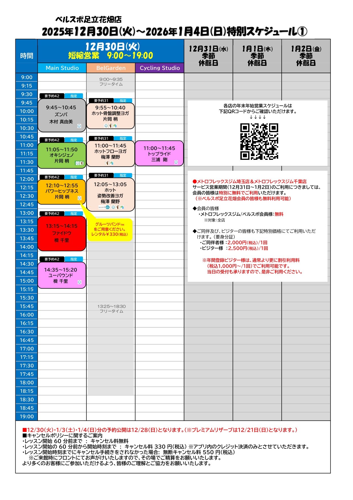 【ベルスポ】2025-2026年 年末年始特別スケジュールのご案内 2025年12月19日 総合, 足立花畑店 いつもベルクススポーツクラブをご利用いただきまして、誠にありがとうございます。 2025-2026年 年末年始特別スケジュールのご案内をいたします。 PDFは⇒コチラから 皆様のご来館をこころよりお待ちしております。 ベルスポ足立花畑店 ☎03-3885-3776