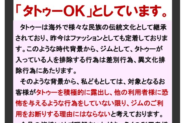【メトロフレックスジム】メトロフレックスジムはタトゥーOKの施設です。 タトゥーは海外で様々な民族の伝統文化として継承されており、昨... read more → 2025年12月23日 千葉店, 総合, 埼玉店